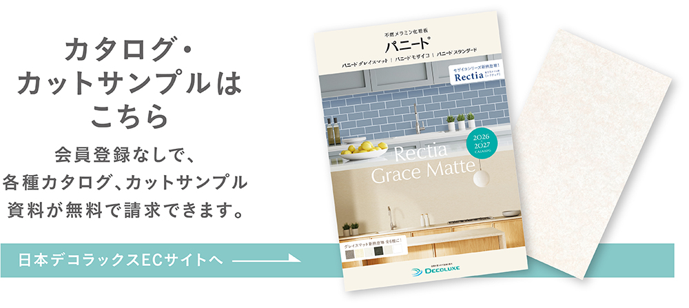 表面にメラミン樹脂を使用している為、傷・汚れ・熱・水に強く、キッチン・洗面のほか、あらゆる水廻りの壁面に適しています。