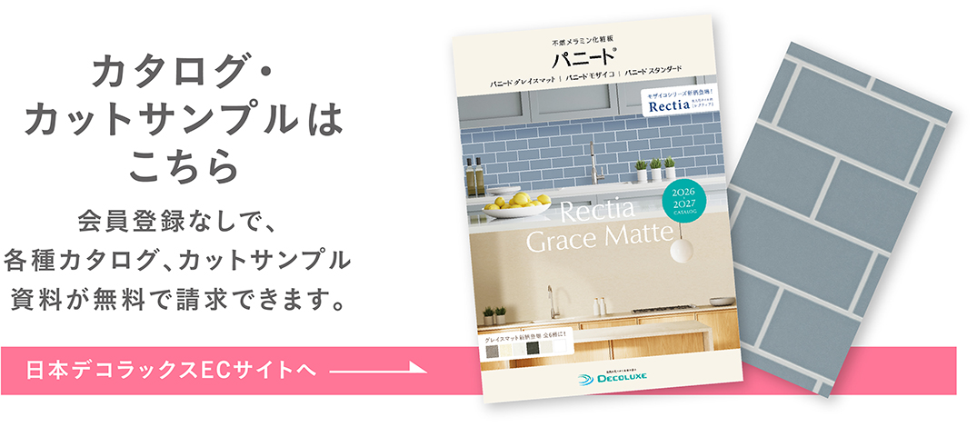 「パニート®モザイコ」は、当社の「パニート®」の性能はそのままに、業界初となるタイル柄とエンボスの凹凸を同調させる技術で、タイルのような立体感あふれる意匠性を再現した不燃メラミン化粧板です。「Rectia(レクティア)」は落ち着いたトレンドカラーと洗練されたデザインを備えた、長方形のサブウェイタイル柄です。
